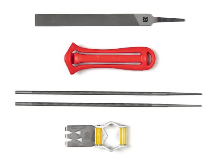 Заточные наборы Husqvarna содержат рукоятку для круглых и плоских напильников, комбинированный заточной шаблон, два круглых и один плоский напильники.